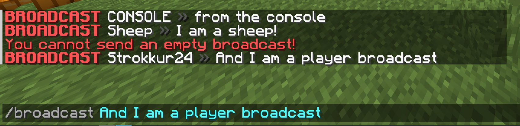作为示例,我们可以创建一个简单的广播命令。我们首先通过创建一个实现 BasicCommand 并重写 execute 和 permission 的类开始: