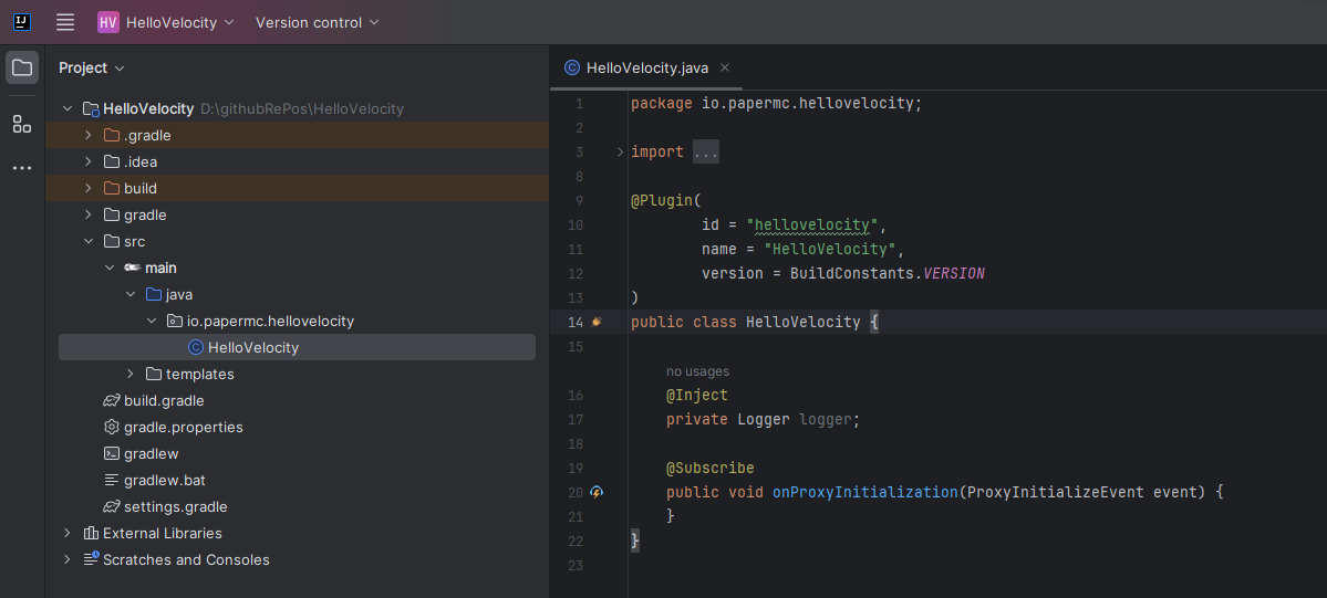 如果你想简化插件测试过程,你可以使用 Run-Task Gradle 插件。 它会自动下载一个 Velocity 服务器并为你运行它。